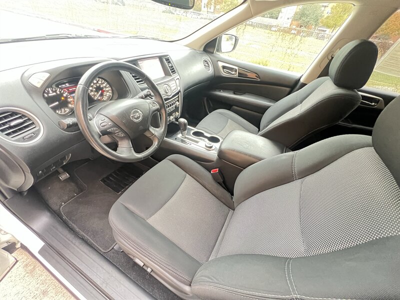 Introducing the 2018 Nissan Pathfinder S, a versatile SUV designed for both family adventures and daily commutes. Under the hood, it features a robust 3.5L V6 engine that delivers 284 horsepower and 259 ft-lbs of torque, ensuring a smooth and powerful driving experience. The exterior is finished in a sleek Magnetic Black, while the interior boasts a comfortable Charcoal fabric that enhances the cabin's modern feel.
